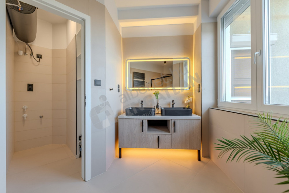 - Bathroom with two washbasins and a comfortably spacious shower