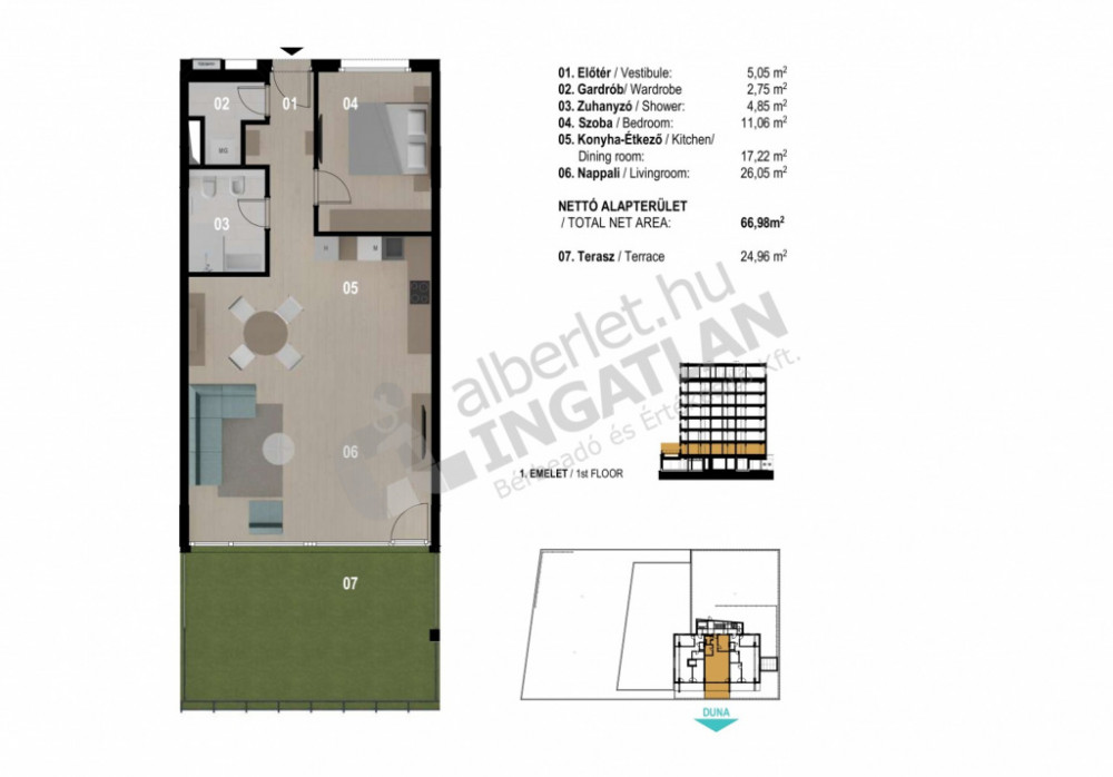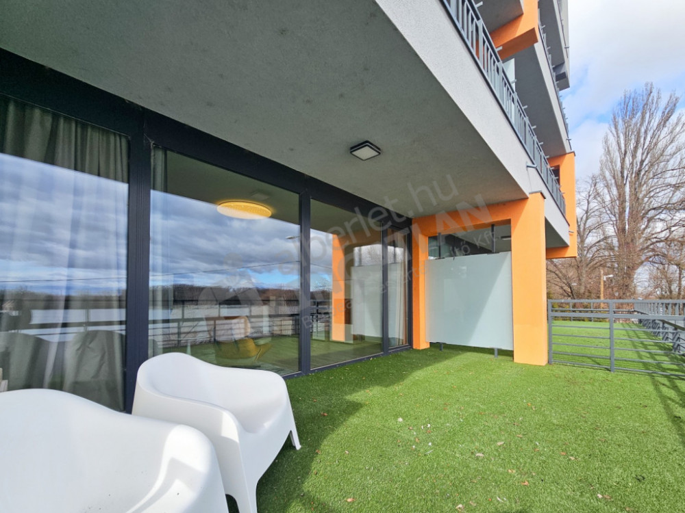 The spacious living room leads to the 24 square meter terrace, from which the view of the Danube opens up before us. Morning coffee or evening wine on the terrace becomes a special experience, while the proximity of the water provides peace and relaxation.