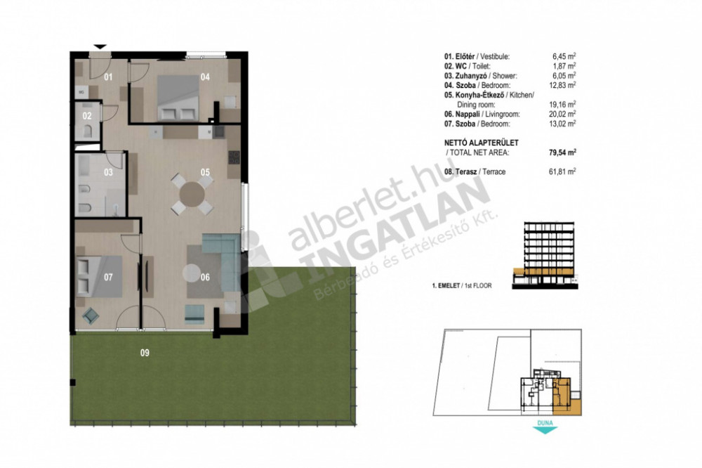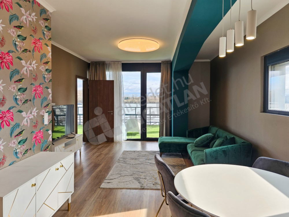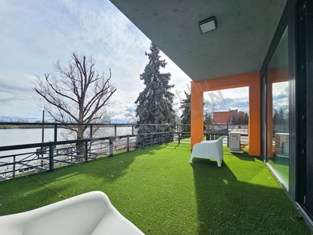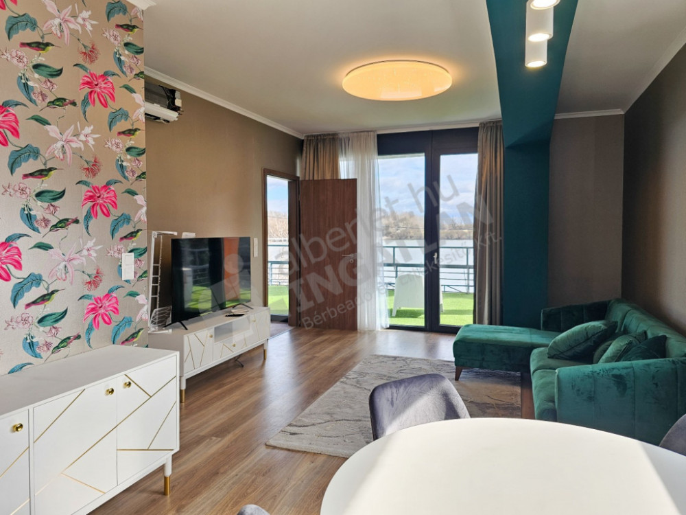 The spacious living room leads to the 29 square meter terrace, from which the view of the Danube opens up before us. Morning coffee or evening wine on the terrace becomes a special experience, while the proximity of the water provides peace and relaxation.