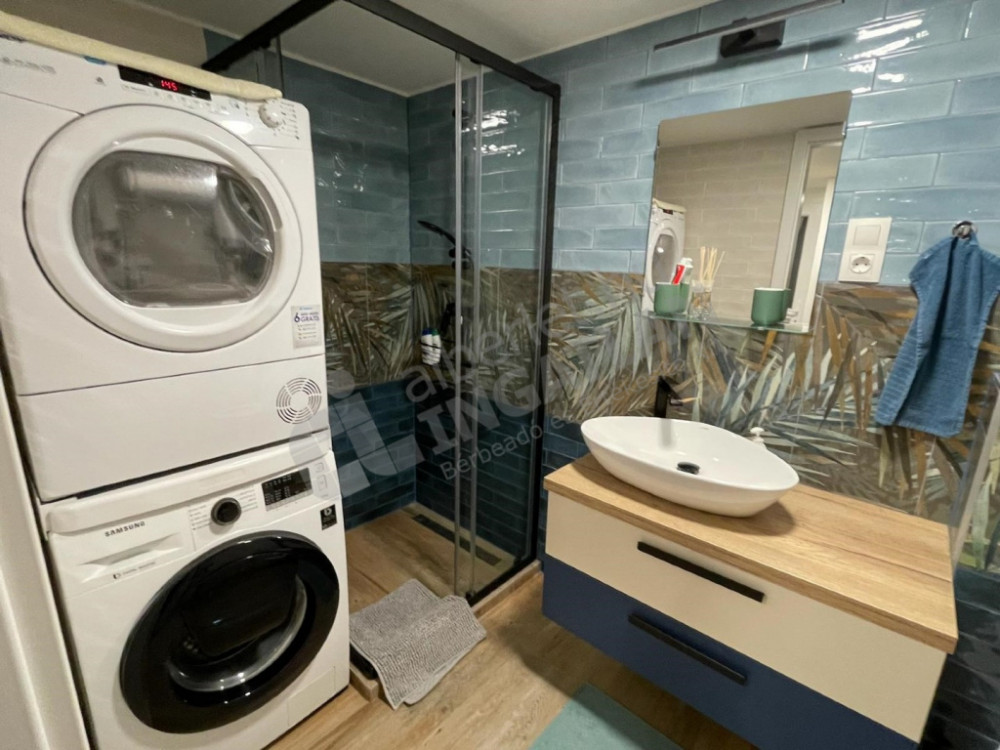 The apartment has a practical layout: next to the fully equipped kitchen, there is a spacious hall with a large built-in wardrobe. One bedroom has a double bed and a wardrobe, the other room has a single bed. The bathroom is equipped with a shower, toilet, washing machine and dryer.