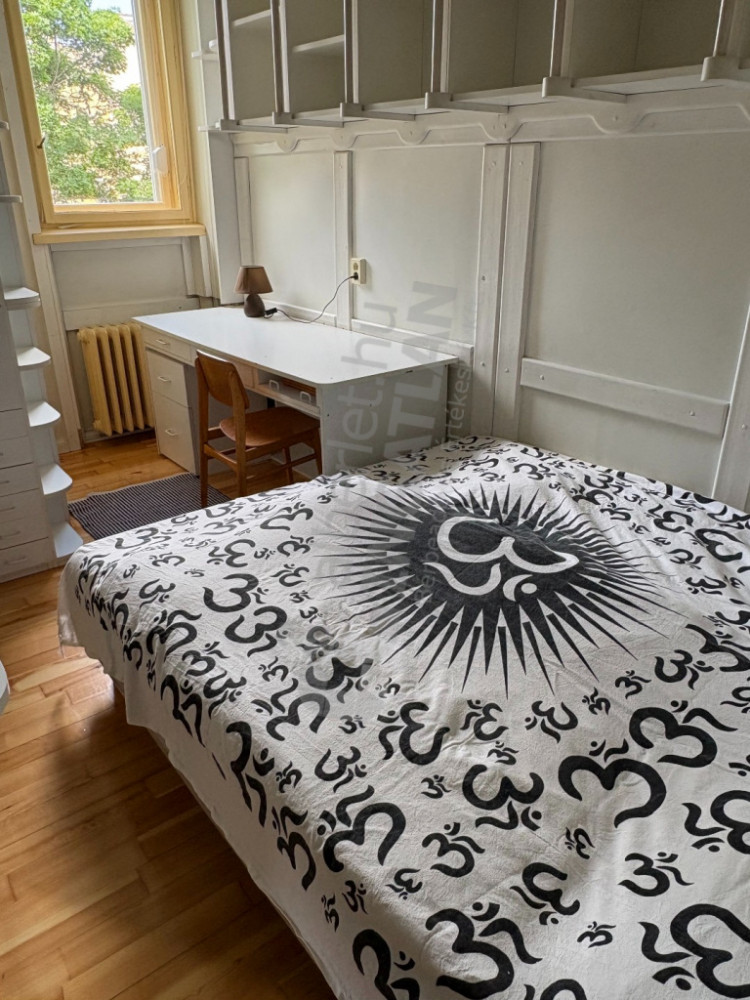 A large bedroom (with double bed), 2 smaller bedrooms (double bed, single bed), and a living room with an American kitchen, with full kitchen equipment (electric hobs, oven, dishwasher, refrigerator, built-in kitchen furniture), bathroom and toilet separately, hallway + small storage + separate wardrobe with lots of shelves.