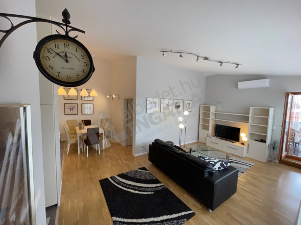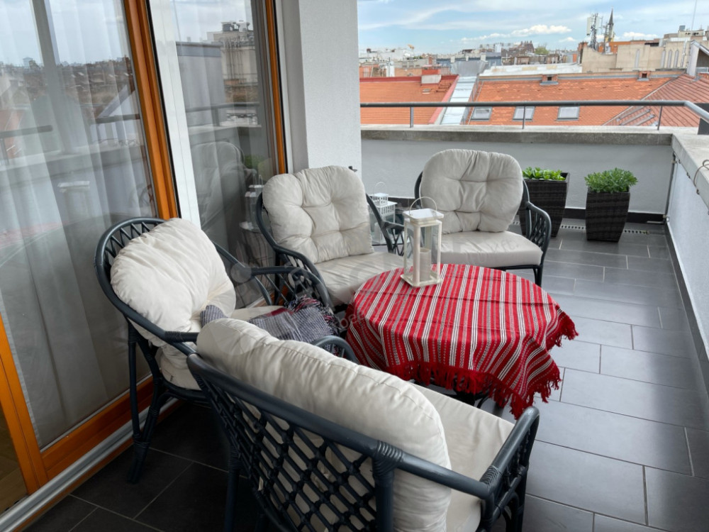 An exclusive, top-floor penthouse apartment for long-term rent in the heart of District VI, in the prestigious Heléna House.