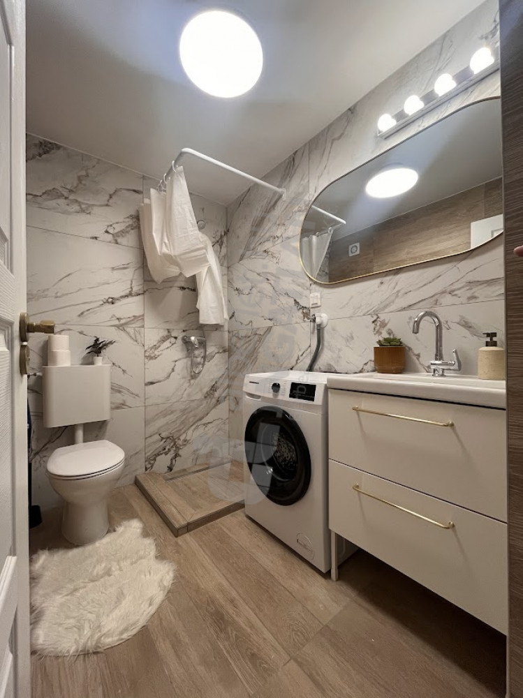 - 5 sqm bathroom with shower, washbasin and toilet, washing machine (below)