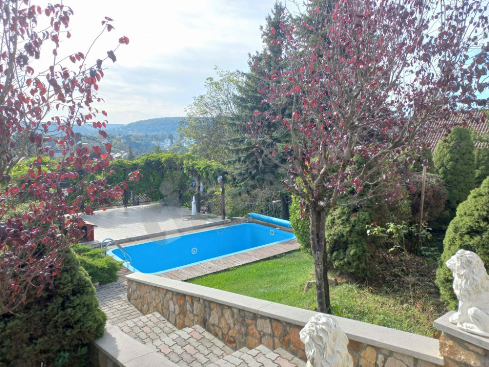 Ez a gyönyörű háromszintes családi ház egy 1362 négyzetméteres, délnyugati fekvésű telken található, kilátással a városra és a környező területekre. Az előkertben egy kerti medence is helyet kapott, ahol a nyári napokat pihenéssel és úszással töltheti.