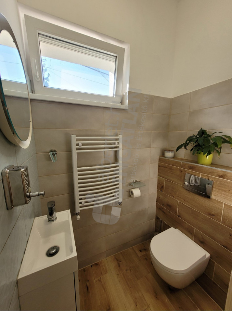 A ház földszintjén az előszobából nyílik egy vendégmosdó, egy zuhanyzós fürdőszoba wc-vel, itt kapott helyet a mosó és szárítógép is. Az előszobában beépített cipősszekrény és előszobafal található.
