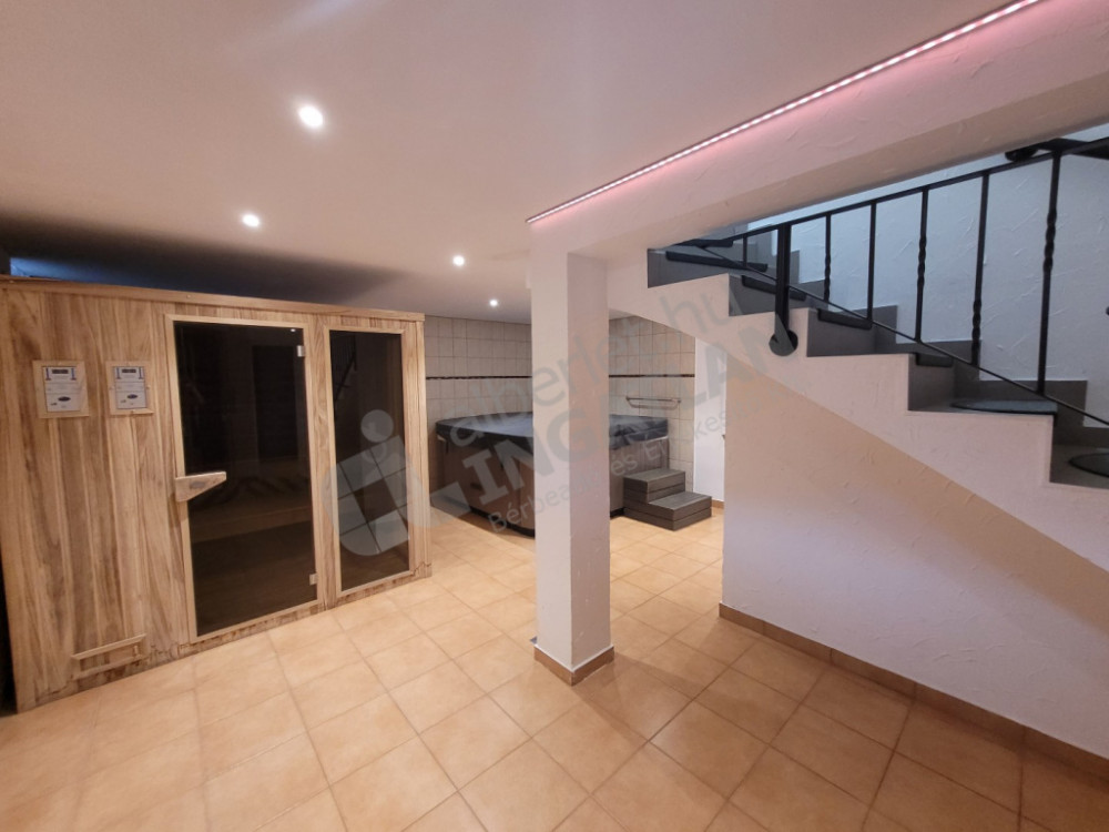 A ház pince szintje a földszinti előszobából nyílik, kényelmes lépcső vezet le. Itt egy wellness részleg került kialakításra, 5 férőhelyes wellis jakuzzi, egy tágas wellis infra és finn szauna, valamint egy wellis gőzkabinos zuhanyzó. Egy külön wc is található még itt. Illetve egy kazánhelyiség.