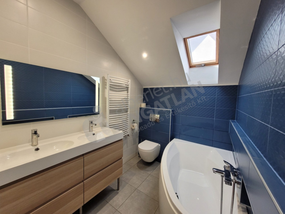 A ház emeleti szintjén 6 hálószoba került kialakításra. Egy közös kádas fürdőszoba wc-vel és dupla csapos mosdószekrénnyel. A szülői hálóban wellis szabadonálló kád saját mosdóval és wc-vel, valamint beépített gardróbszekrénnyel. A kád miatt a szülői háló speciális spc-vel burkolt.