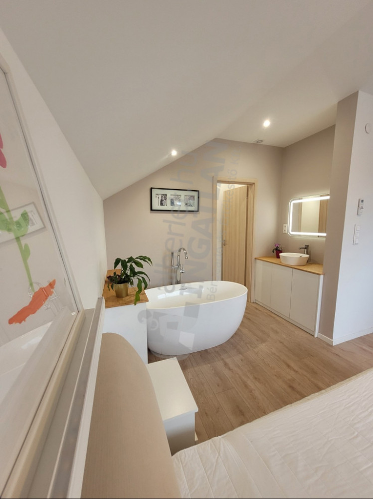 Az emeleti szobák között kétrétegű gipszkarton és hangszigetelős közetgyapot került beépítésre. A 6 szobából egyet akár irodaként is lehet használni. Az emeleten a lépcső mellett egy szennyesledobó is kiépítésre került.