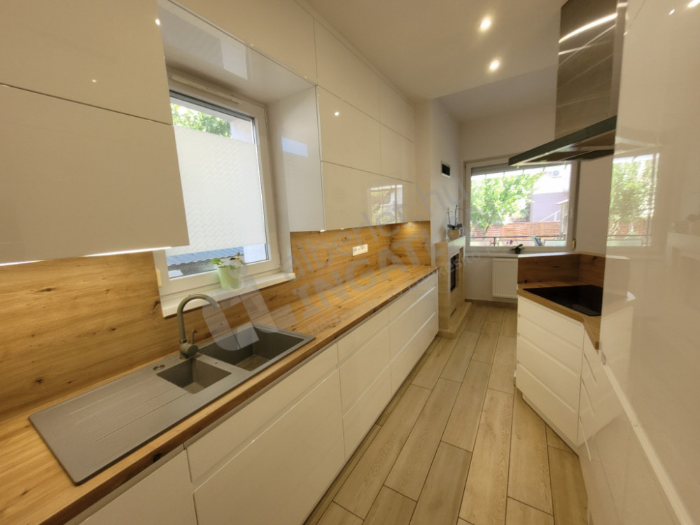 A földszinten található a konyha egy északra néző spájzzal, az étkezőhelyiség, amiben egy fatüzelésű Szabó-kandalló került kialakításra. Konyhában minőségi magasfényű beépített konyhaszekrény, beépített gépekkel. Bosch wifis mosogatógép, beépített mikrohullámű sütő, beépített wifis sütő. A beépített hűtő 400 literes. Bosch indukciós főzőlap, cata páraelszívó külső kivezetéses.