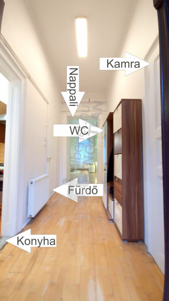 Nappali, külön hálószoba, konyha, fürdőszoba, külön WC, valamint kamra és előszoba.